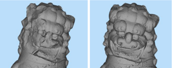 石雕缺失部分的电脑雕刻补配是修复工作中的另一项创新。借助手持式扫描仪进行三维扫描,运用软件将雄狮对应的部位拼接到雌狮缺失的部位上,再经过精细修改得到修复目标的三维图像信息。