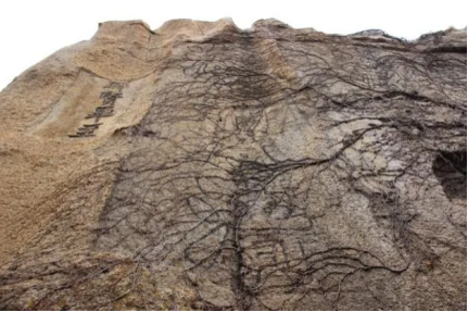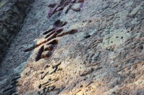 还有裂缝移位。珠宝岭北摩崖石刻的岩体出现了显著的位移,其中最宽的裂缝超过了 5 厘米,导致部分石刻错位和损坏。由于当地气候湿润,裂缝中已经长出了植物的根系,随着根系的生长,这些裂缝可能会进一步扩大。