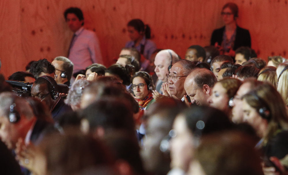 2015年12月12日,中国气候变化事务特别代表解振华(中)在《巴黎协定》达成后发表讲话。新华社 图