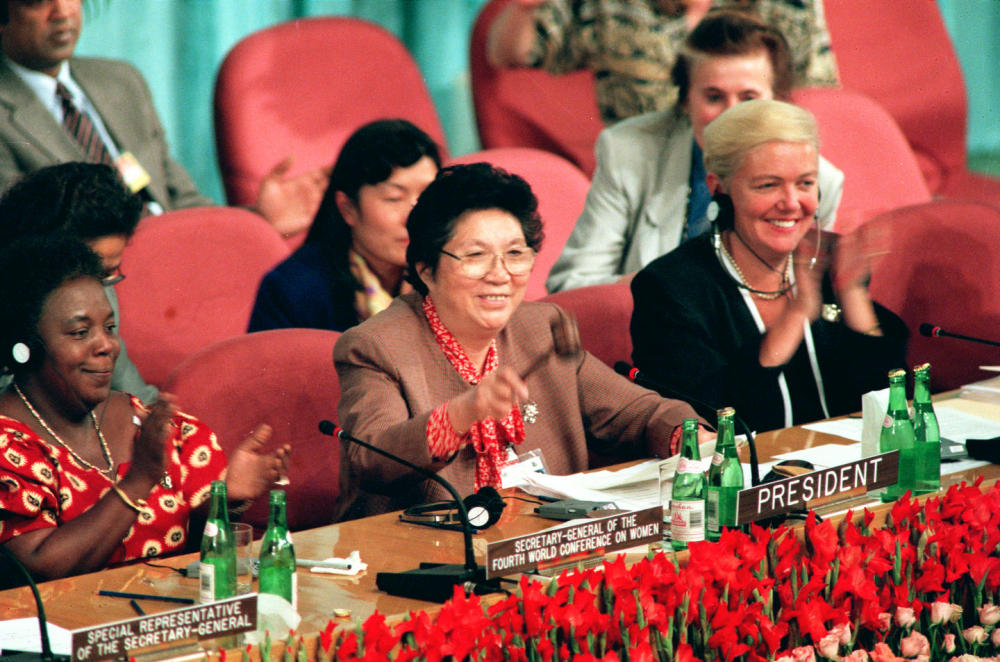 1995年9月15日,联合国第四次世界妇女大会在北京闭幕。大会主席陈慕华以击槌方式宣布通过《北京宣言》。北京世界妇女大会是联合国历史上一次重要会议,被认为是联合国妇女工作史上的里程碑,来自197个国家和地区的1.76万名代表与会,讨论全球妇女事业诸多重大议题并通过《北京宣言》和《行动纲领》。