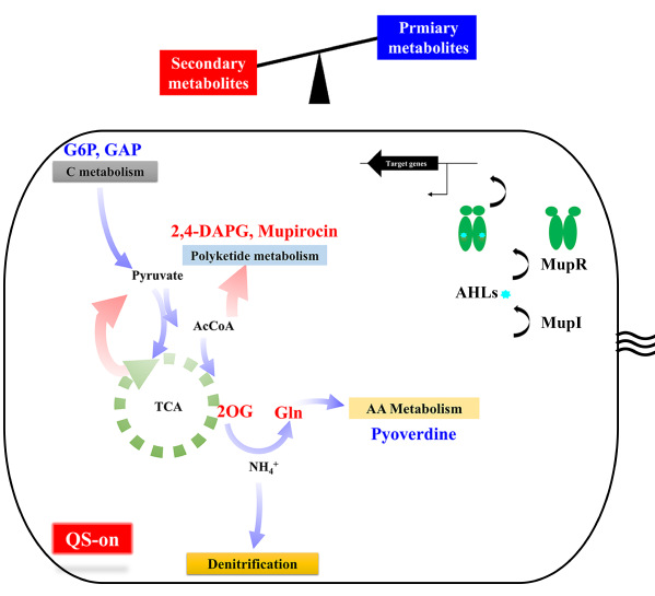群体感应调控荧光假单胞菌2P24 碳氮代谢及代谢资源重分配以平衡生长与公共物品合成示意图