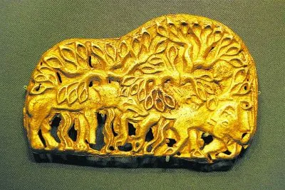 青海博物馆收藏的战国匈奴狼噬牛金牌饰为战国时期匈奴文化金器,以纯金铸造,采用浮雕技法呈现山峦森林间狼噬牛的生动场景。