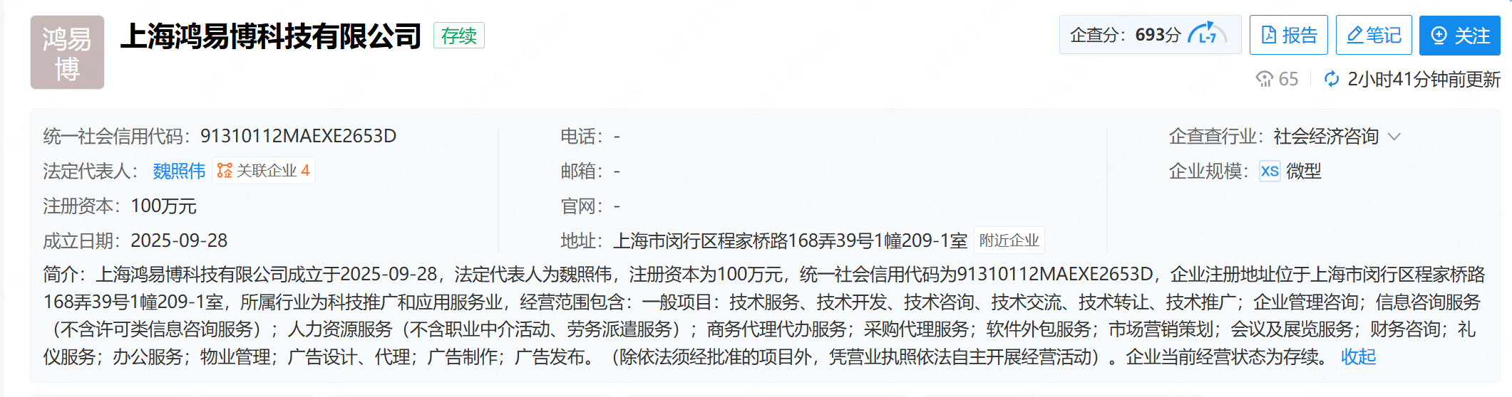 相关资料显示,公司名为上海鸿易博科技有限公司,法定代表人为魏照伟,经营范围包含:采购代理服务;软件外包服务;市场营销策划;会议及展览服务等。