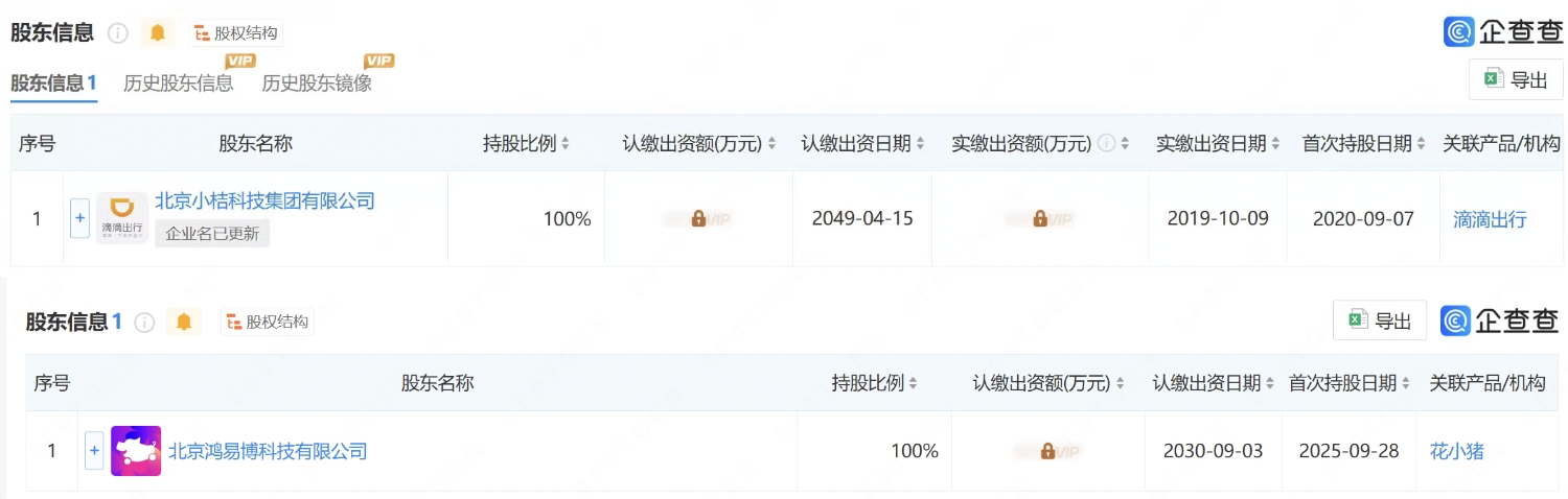 此外,企查查股权穿透显示,该公司由北京鸿易博科技有限公司全资持股,两家公司的法定代表人都为魏照伟,而北京鸿易博科技有限公司则由滴滴出行关联公司北京小桔科技集团有限公司全资持股。