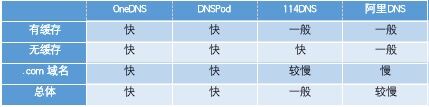 在DNS Benchmark中响应速度越快的越靠前,红色、绿色、蓝色长条分别表示有缓存、无缓存和.com域名的响应时间,有缓存时由所查询的DNS服务器直接返回解析结果,无缓存时向上级DNS逐级迭代查询。可以看出OneDNS和DNSPod在三项测试中响应速度令人满意,114DNS表现尚可,阿里DNS总体就有些一般了。(此结果仅供参考,受地域和线路的影响,不同地域和运营商测试结果可能会有些许差异。)