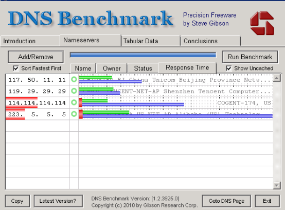 再来说感受不到它存在的地方。对DNS来说解析速度绝对重要,有不少人用ping来测DNS的速度,这其实很不准确,ping命令是基于ICMP协议,DNS是基于UDP协议,完全是两个不同的概念。测试DNS的解析延迟,用专业的DNS测速软件DNS Benchmark更靠谱。