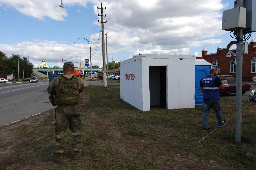 2024年8月12日,在俄乌边境俄方一侧别尔哥罗德州首府别尔哥罗德市,军人在临时掩体旁执勤。新华社发