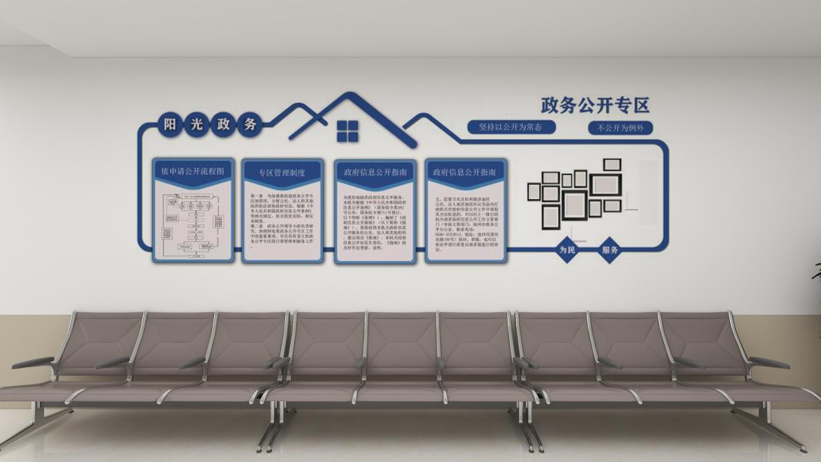 2.同一专区内各个功能区标识设计风格应保持统一,多以蓝白或红白色调为主,专区内要有明显文字标识标注“政务公开专区”。