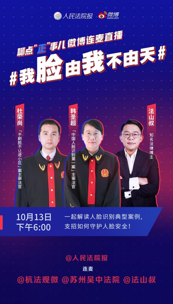 10月13日晚,@人民法院报 首次微博连麦直播,聚焦人脸识别话题#我脸由我不由天#,一起解读人脸识别典型案例,支招如何守护人脸安全。@杭法观微 @苏州吴中法院 办案法官与法律大V@法山叔 在线分享,人民法院新闻传媒总社记者李璇主持。