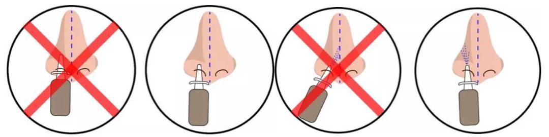 (1)不要把喷头完全塞进鼻孔,只需将喷头前端置入前鼻孔,因为喷雾有一定的辐射范围。喷头的方向应对准鼻腔外侧,而不是鼻中隔(左手喷右鼻孔,右手喷左鼻孔)。