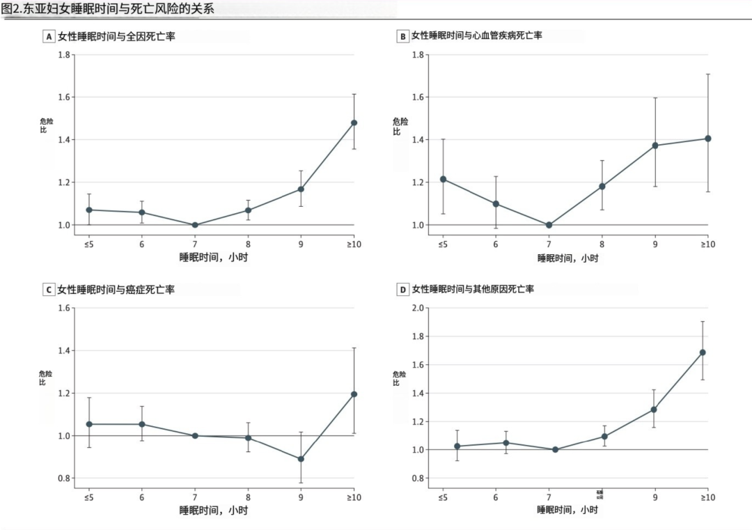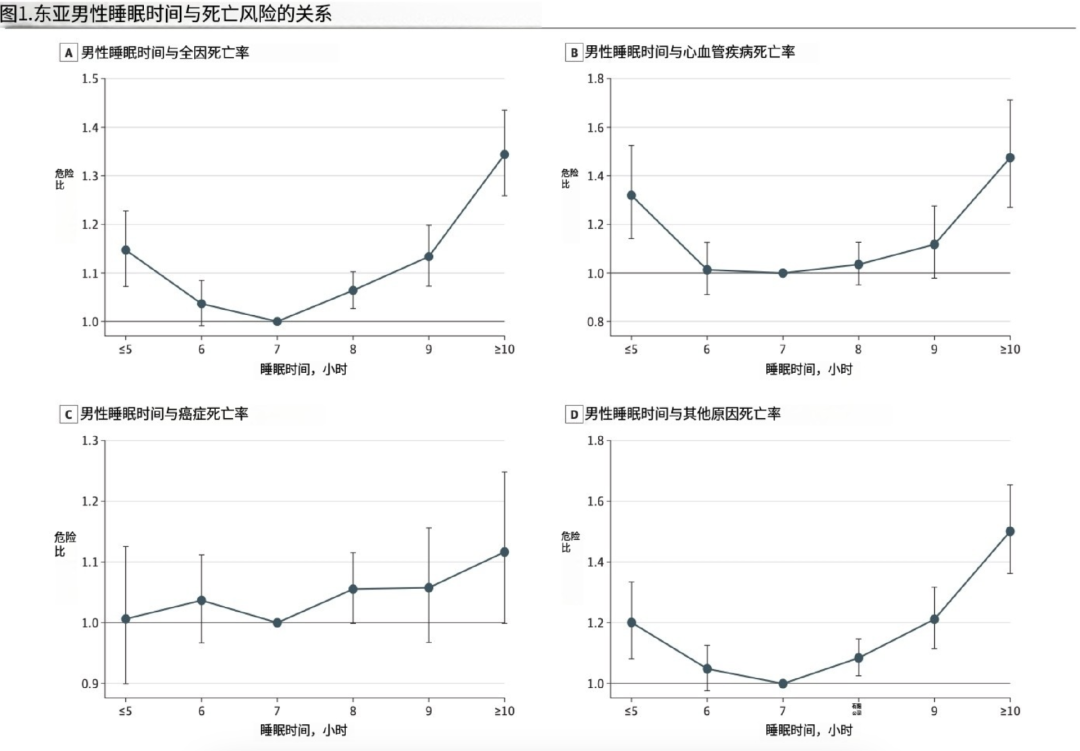 2021 年,一项囊括了约 32 万参与者的研究,探讨了日本、中国、新加坡和韩国四国成年人睡眠时间与全因死亡率和主要原因死亡率的关系,并将结果发布在了《美国医学会杂志》上,结论显示[2]: