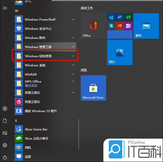 1. 进入到电脑菜单后,点击“windows轻松使用”;