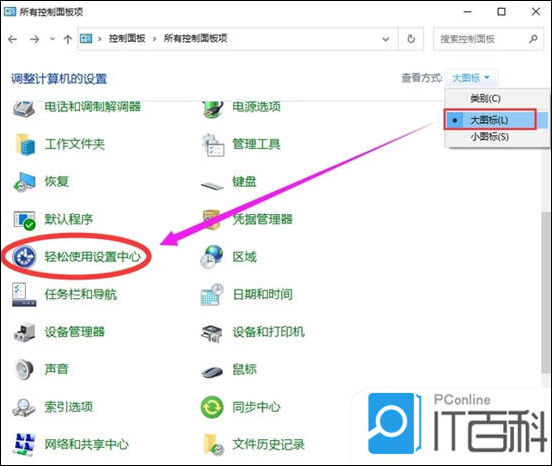1. 首先在电脑上打开控制面板,将右上角的查看方式改为“大图标”,然后选择“轻松使用设置中心”;