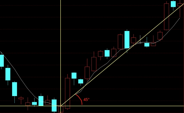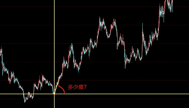 但是在交易软件上,x轴是周期,y轴是价格,x、y值单位不同,没有可比性。我们通过下面两张图,可以发现问题所在。对于同样一段行情,当这一段行情放大的时候,我们一眼看上去,均线角度可能是45°。如果把这一段行情缩小,均线的角度发生了明细的变化,显然大于45°。这样均线的角度就没有意义,因为会随着K线图的放大缩小而产生变化。