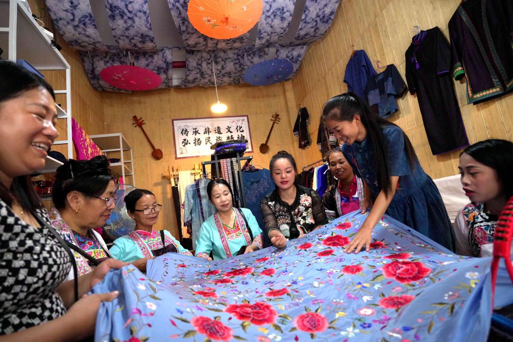 2023年8月27日,绣娘们在贵州省黔东南苗族侗族自治州黎平县龙形街道一家非遗传承室里讨论刺绣产品。新华社发(王炳真 摄)