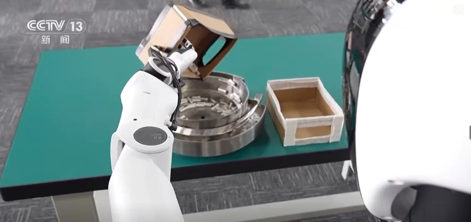 有了真实的场景和“老师”,这些机器人的成长速度更快了。像这台自动配料机器人,刚来的时候连这个小纸箱都拿不住。而经过两个月的训练,如今不仅可以稳稳地抓住箱子,还能熟练地将箱子里的物料准确倒进桶里,自主完成整个配料过程。