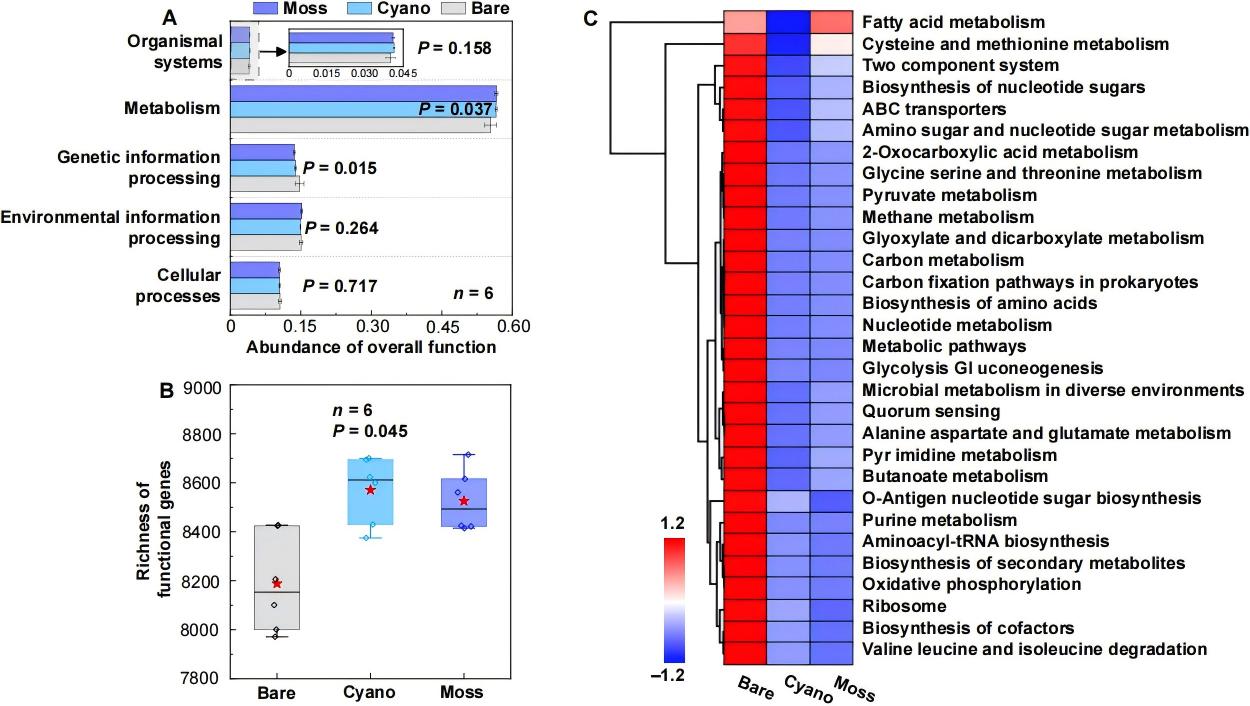 图3 生物结皮对夯土微生物群落总体功能潜力的影响