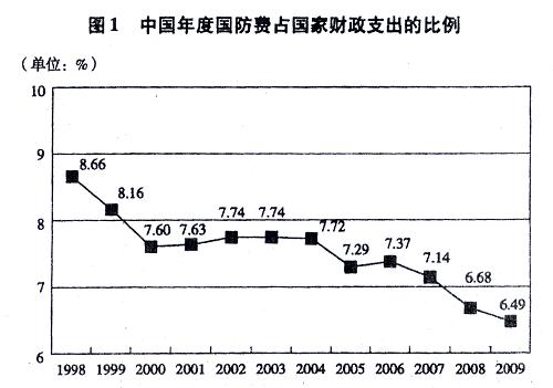 随着国家经济社会发展,中国国防费保持适度合理增长。2008年和2009年,中国国内生产总值分别为314045亿元人民币和340903亿元人民币。国家财政支出分别为62592.66亿元人民币和76299.93亿元人民币,分别比上年增长25.7%和21.9%。2008年和2009年,中国年度国防费分别为4178.76亿元人民币和4951.10亿元人民币,分别比上年增长17.5%和18.5%。近年来,中国年度国防费占国内生产总值的比重相对稳定,占国家财政支出的比重略有下降。