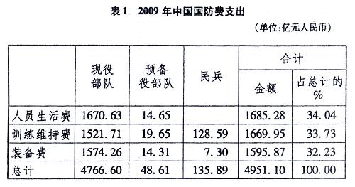 中国国防费主要由人员生活费、训练维持费和装备费3部分组成,各部分大体各占三分之一。人员生活费用于军官、文职干部、士兵和聘用人员的工资津贴、住房保险、伙食被装等。训练维持费用于部队训练、院校教育、工程设施建设维护以及其他日常消耗性支出。装备费用于武器装备的研究、试验、采购、维修、运输和储存等。国防费的保障范围包括现役部队、预备役部队和民兵,同时也负担部分退役军人、军人配偶生活及子女教育、支援国家和地方经济建设等社会性支出。