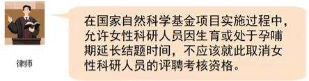 “支持孕哺期女性科技人才科研工作。为孕哺期女性科技人才营造良好科研环境。鼓励科研单位设立女性科研回归基金,资助女性科研人员生育后重返科研岗位。在考核评价、岗位聘用等环节,对孕哺期女性科技人才适当放宽期限要求、延长评聘考核期限。支持高等学校和科研院所商孕哺期女性科研人员在孕哺期保留研究生招生资格。在国家自然科学基金项目实施过程中,允许女性科研人员因生育或处于孕哺期延长结题时间。”