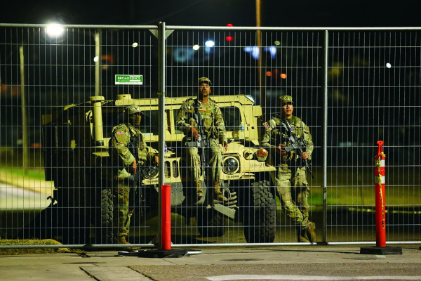 当地时间27日,美国得克萨斯州国民警卫队士兵在美墨边界附近的谢尔比公园执勤。