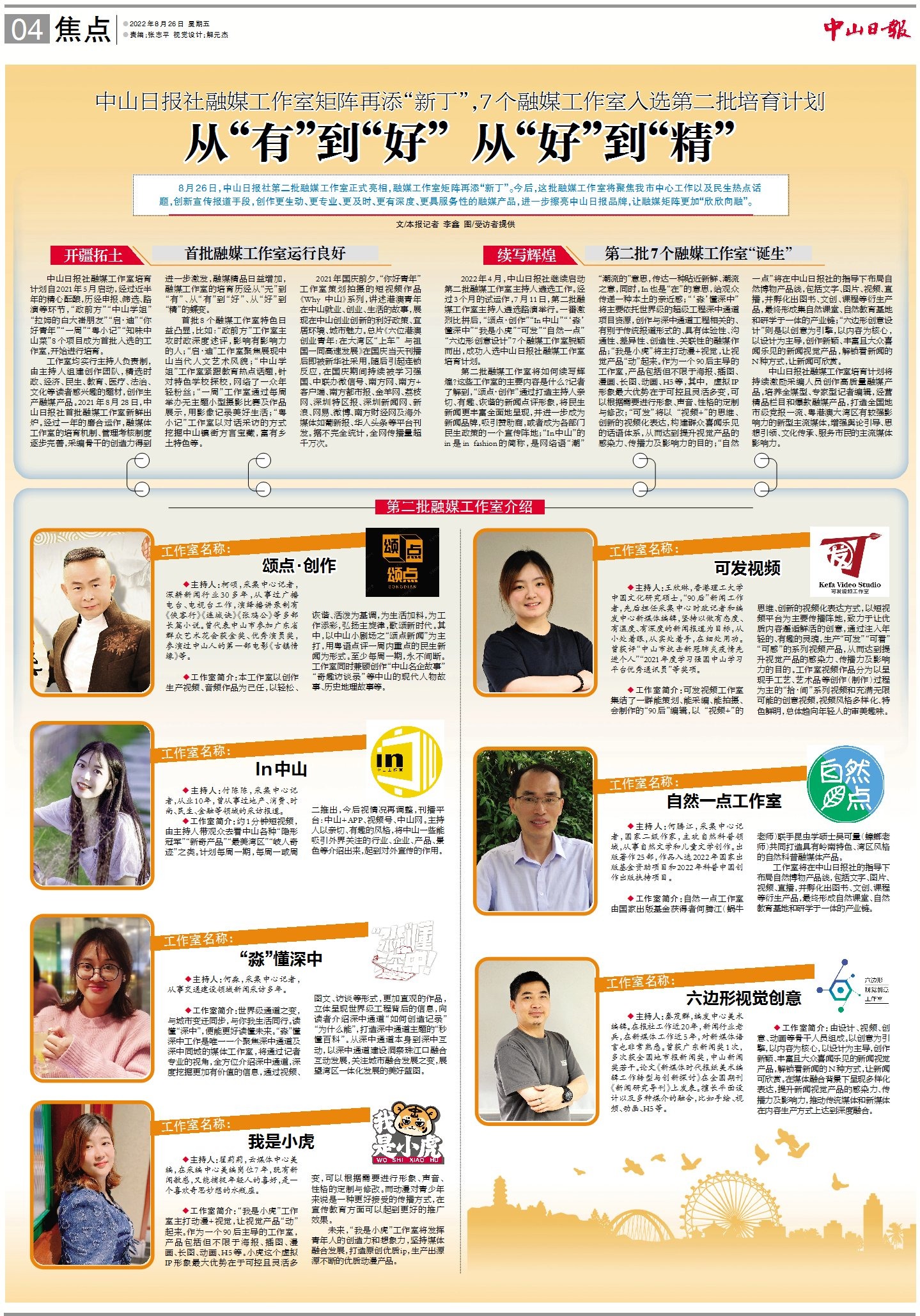 2022年,首批8个融媒工作室经过近一年的尝试,生产运营、考核评审模式逐渐理顺。8月,第二批7个融媒工作室开始运作。融媒工作室是中山日报社对内容生产、运营模式和激励机制的创新。每个工作室每年可获8万-10万元的培育扶持经费,通过培育,既激励内容创新,又促进采编人员快速转型。