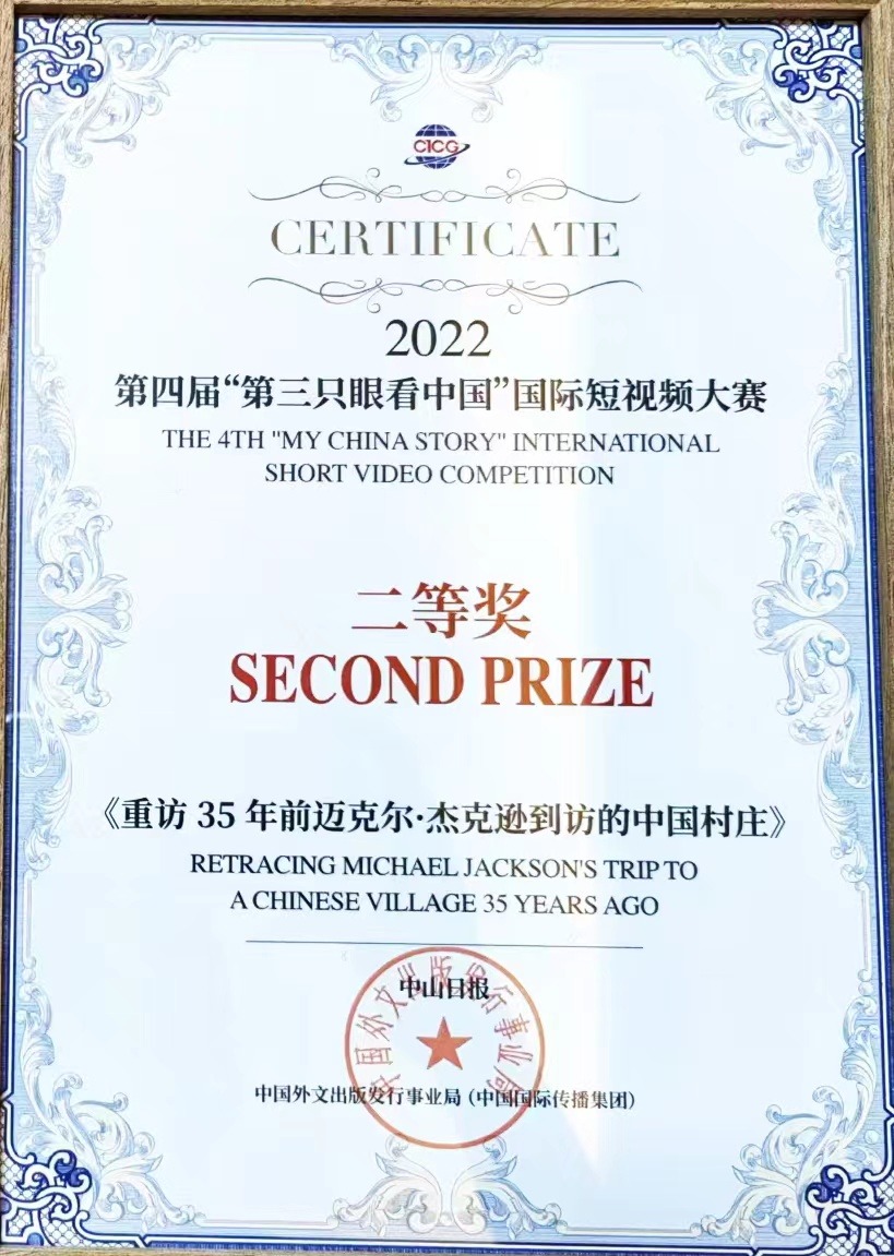 2022年9月,报社外宣短视频《老外村游记|重访35年前迈克尔•杰克逊到访的中山村庄》,在中国外文局主办的2022年第四届“第三只眼看中国”国际短视频大赛中,获得“宜居城市 美丽乡村”单元二等奖。