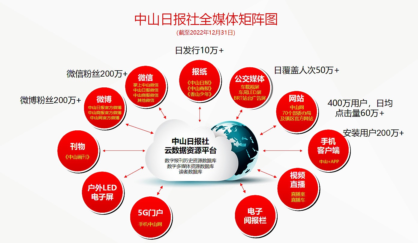2022年,中山日报社坚持建设一体化的“3+N”全媒体传播矩阵(“3”是传统媒体《中山日报》《中山商报》和《中山画刊》,“N”分别是数字报、中山网、手机报、官方微博微信、手机客户端、户外LED电子屏、公交联播平台等),做强客户端、做活微矩阵、做优网站。内容传播上,极大突破了传统报纸发行的时空局限,每天有20多个平台和渠道24小时滚动发布新闻、信息等内容,实现新闻资源传播价值的最大化。中山日报社的传播力从原来传统报纸日均发行8万份,到如今通过全媒体矩阵提升至覆盖受众近千万人次,日均点击量50多万人次。