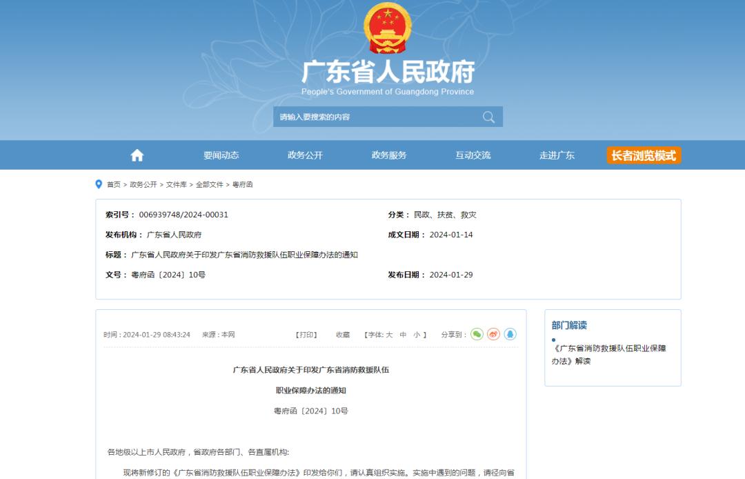 1月29日,广东省人民政府官网发布新修订的《广东省消防救援队伍职业保障办法》,全文32条主要在明确保障对象范围、明确伤亡抚恤保障渠道、完善医疗保障机制、完善伤残保障机制、优化子女教育优待条件、明确退休人员待遇保障等六大方面进行修订。《办法》自印发之日起施行,为期5年。