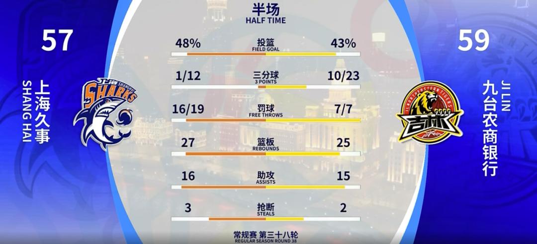 插曲过后,双方继续回到比赛中,吉林队始终维持着8分左右的领先。直到次节还剩3分钟左右时,李弘权底角三分命中,上海队本场比赛的第一记三分终于来了。而这也成为了大鲨鱼在上半场的唯一一粒三分球。半场比赛结束,双方比分暂时为57-59。