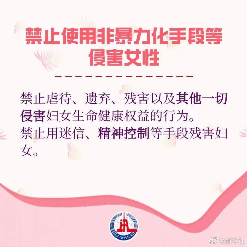 草案规定,妇女的生命权、身体权、健康权不受侵犯。禁止虐待、遗弃、残害以及其他一切侵害妇女生命健康权益的行为。禁止杀害、遗弃、残害、出卖、非法送养女童;禁止歧视、虐待生育女婴的妇女和无子女的妇女;禁止用迷信、精神控制等手段残害妇女;禁止虐待、遗弃病、残妇女和老年妇女。