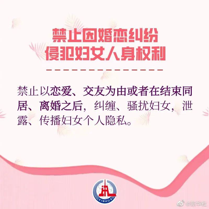 草案新增规定,明确禁止以恋爱、交友为由或者在结束同居、离婚之后,纠缠、骚扰妇女,泄露、传播妇女个人隐私。妇女遭受上述暴力侵害或者面临上述暴力侵害现实危险的,参照《中华人民共和国反家庭暴力法》的相关规定,向人民法院申请人身安全保护令。
