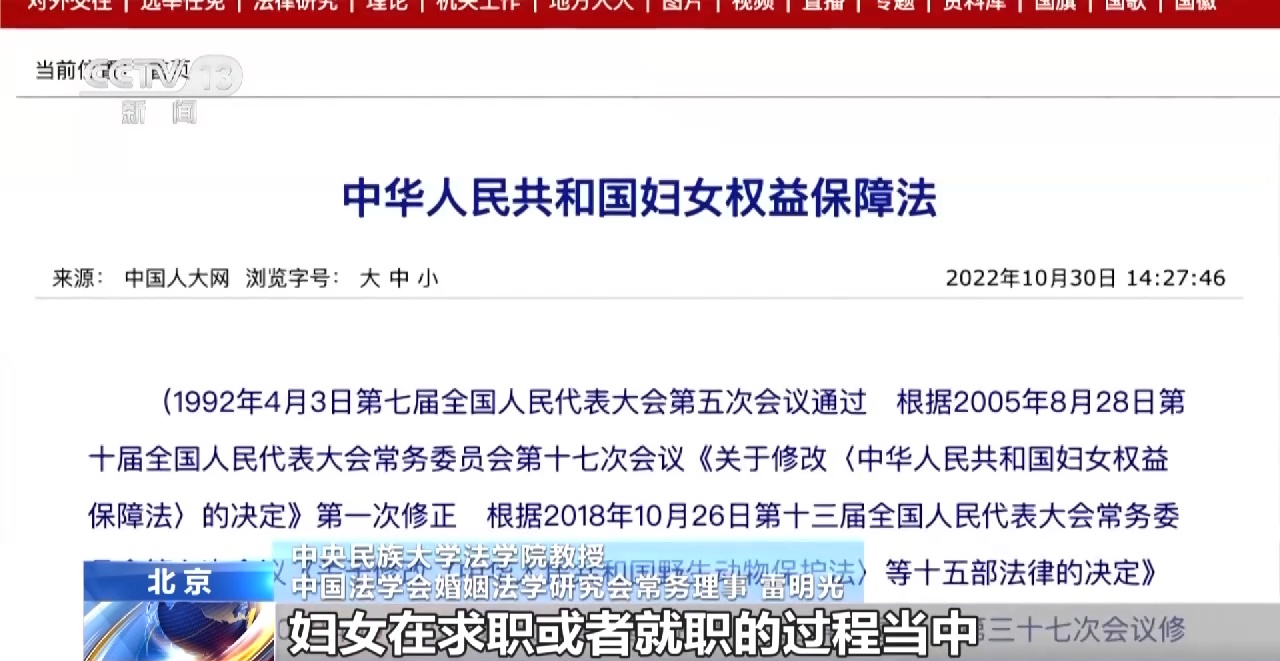 中央民族大学法学院教授、中国法学会婚姻法学研究会常务理事 雷明光:其实我们新修定的妇女权益保障法明确规定,妇女在求职或者就职的过程中,用人单位有几个禁止。首先要禁止去询问求职者的一些隐私,包括婚育状况在内的一些隐私。不能以妇女的怀孕,或者她生育,或者她已经结婚了,把它作为不录用的一个条件。妇女要不要一怀孕就要报告给单位,告诉领导或者告诉相关的人力资源部门,也是没有必要的,也是她们每个员工自己的隐私。比如说降低她的薪资,调整她的岗位,甚至辞退,都不可以。