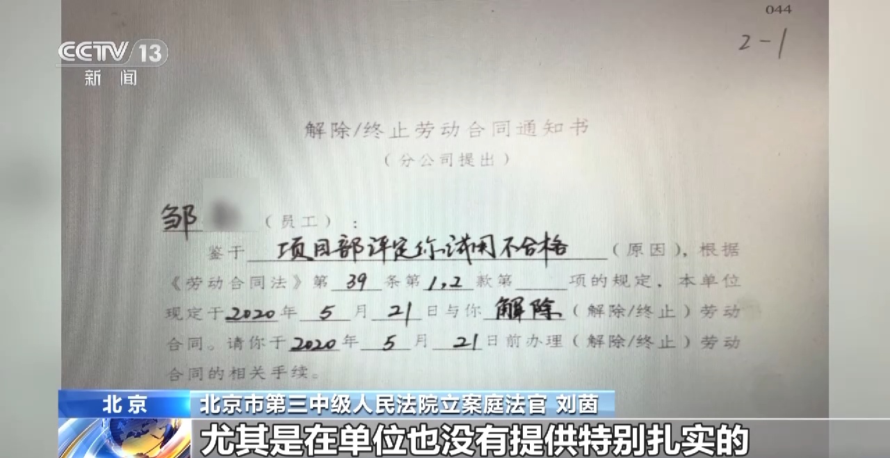 北京市第三中级人民法院立案庭法官 刘茵:所以单位最开始做出的解除决定,以她试用期不合格为由,尤其是在单位也没有提供特别扎实的,证明劳动者不适合这个工作岗位的情况下,我们觉得单位解除事由从法律上肯定是站不住脚的。