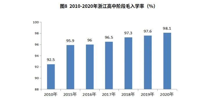 2.义务教育全面发展,基本实现高位均衡。全省学前3年到高中阶段15年教育普及率在99%以上。义务教育由基本均衡向优质均衡跨越发展,县级校际差异系数在0.3以内,是全国最低的省份,义务教育高质量均衡发展位居全国前列。全面消除大班额,城乡基本实现校校标准化。2020年,全省义务教育学校标准化达标率98.0%,比2011年提高76.3个百分点。小学五年巩固率、初中三年巩固率、九年义务教育巩固率均达到100%。高中段教育毛入学率由2010年的92.5%提高到98.1%,分别超过《纲要》和《规划》目标值8.1和0.1个百分点。率先在全国实行全省域推进城乡教育共同体建设,实现所有县(市、区)参与结对帮扶和乡村小规模学校受援结对两个全覆盖,城乡义务教育一体化建设成效明显。2020年,全省义务教育随迁子女总量达 156.1 万人,占全省义务教育段在校生总数的29.1%,其中外省户籍随迁子女占八成,总量位居全国各省第二。