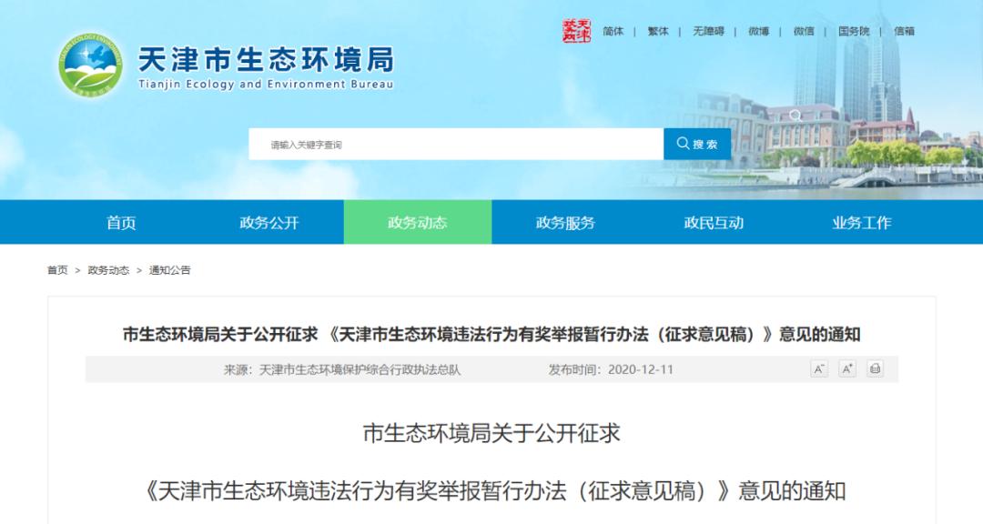 《天津市生态环境违法行为有奖举报暂行办法(征求意见稿)》