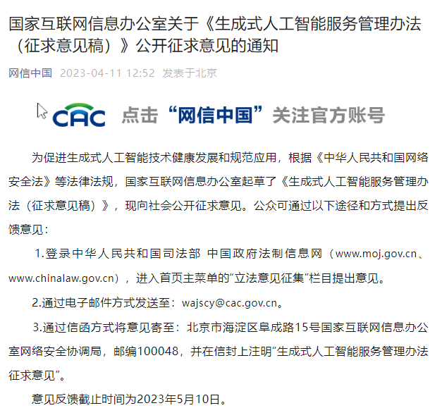 4月11日,国家互联网信息办公室发布《关于<生成式人工智能服务管理办法(征求意见稿)>公开征求意见的通知》,这也是国家首次针对于当下爆火的生成式AI产业发布规范性政策。