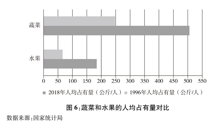 ——膳食品种丰富多样。2018年,油料、猪牛羊肉、水产品、牛奶、蔬菜和水果的人均占有量分别为24.7公斤、46.8公斤、46.4公斤、22.1公斤、505.1公斤和184.4公斤,比1996年分别增加6.5公斤、16.6公斤、19.5公斤、17公斤、257.7公斤和117.7公斤,分别增长35.7%、55%、72.5%、333.3%、104.2%和176.5%。居民人均直接消费口粮减少,动物性食品、木本食物及蔬菜、瓜果等非粮食食物消费增加,食物更加多样,饮食更加健康。
