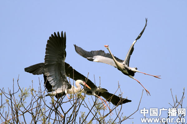 中广网九江6月28日消息(徐红波 张翔 杜素英)随着夏季的到来,在鄱阳湖区繁育后代的夏候鸟与日俱增,成群的鸟儿在湖面、枝头、草洲上尽情嬉戏翩翩起舞,形成一道道靓丽的风景。