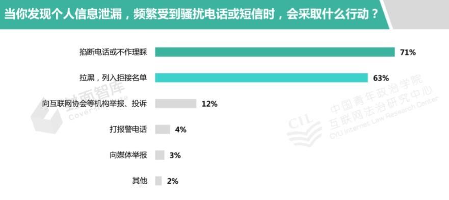 在被问到发现个人信息泄露会采取什么行动的问题时,71%的参与调研者选择了掐断电话或不予理睬,选择拉黑及拒接的比例为63%;仅有20%左右的参与调研者选择了举报、投诉、报警等积极应对措施(图10)。