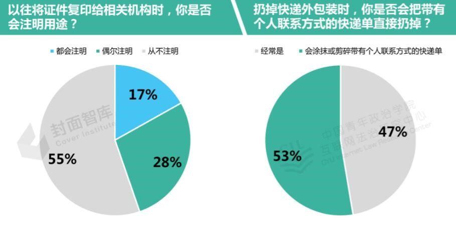 在日常生活中,证件复印件、快递单和手机是泄露个人信息的重要载体。问卷调研显示,由于对个人信息泄露渠道的不了解,虽然大多数人意识到个人信息泄露的严重程度,但相当高比例的人群并不知道如何防范个人信息侵害,在使用个人信息的载体时疏忽大意或不知如何采取防范行动。