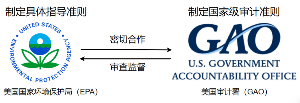 明晰的组织架构和持续连贯的审计工作是美国碳审计发展的重要基石。美国碳审计的实施机构主体为美国审计署(GAO)和美国国家环境保护局(EPA),二者分工明确,相互合作又存在制约,共同保障了碳审计准则体系的制定和成功实施。在碳审计准则制定方面,美国审计署主要负责宏观层面的规则制定,而美国国家环境保护局侧重于碳审计的具体指导准则和方针。在职责权力方面,美国审计署隶属于美国国会,美国国家环境保护局则直接向总统汇报,美国审计署对国家环境保护局具有审查监督的权力;在实施审计过程中,环保局又需要与美国审计署的自然资源利用与保护司密切合作。