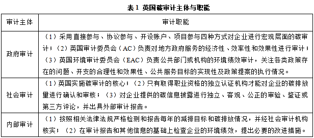 协同并进的碳审计主体网络和统一健全的碳审计评估标准是英国碳审计发展的核心驱动力。作为国际低碳审计领域的先行者,英国已经发展并完善了以政府审计为主导、社会审计和内部审计协同合作的碳审计网络,同时成立了专门负责碳审计问题的地方审计委员会,其丰富的碳审计主体催生了多样化的审计职能。