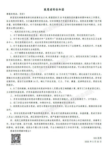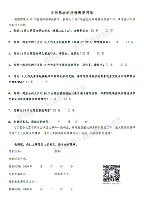 最后,我们为医疗机构专门设计了《致患者的告知函》、《患者及陪诊人员登记表》、《收治患者疫情调查问卷》等模板,并附上国家卫健委《通知》及其量表附件,以供参考,详见附件。