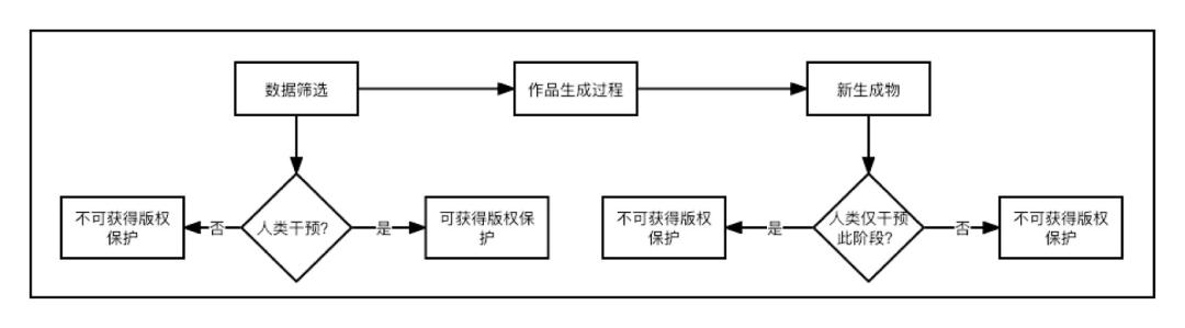 在创作过程中使用先进的人工智能系统并不意味着人类将其创作的重要过程都交给了机器,在作品创作过程中,人类可以在作品生成的不同阶段以多种方式做出创造性的选择。例如,在前期的数据筛选,后期的编辑等阶段人类都可能扮演着非常重要的角色。国际保护知识产权协会协会在各国报告的基础上得出人类对于人工智能生成物的干预应该存在于创建人工智能实体以实现特定目标、选择要输入的数据以及创作新作品的阶段。协会在2019年的伦敦大会上发布了《人工智能的版权问题》决议,决议进一步对何为人类干预进行了解释,人类干预指人类参与了输入人工智能的数据或该数据的筛选标准。在决议看来人工智能生成物所具备的独创性产生于生成物形成过程中的人类干预,该独创性应是受版权保护的条件之一。决议认为人工智能生成物只有在其生成过程中人类干预的情况下,且在该生成物符合受保护作品应满足的其他条件的情况下,才能获得版权保护;对于生成过程无人类干预的人工智能生成物,其无法获得版权保护。部分生成式下著作权不会因为人工智能对作品有创造性贡献而取消,作品中的人类因素足以支持作品获得著作权的保护。