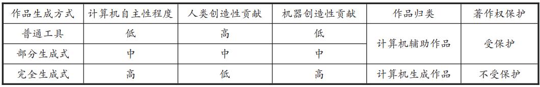 当人工智能应用程序被用于生产时,还需要进一步区分它是仅仅作为人类创造性的工具或手段,还是人类已经放弃了对生产过程及其结果的控制。在Payer Components South Africa Ltd v Bovic Gaskins案中“计算机辅助”和“计算机生成”作品的区分得到了认可。在前一种情况下,计算机只是一种工具,就像笔或文字处理器一样。当计算机被用来辅助人类作者时,即使它“暗示”了表达元素,但过程的控制权仍由作者掌握,此时人类可以干预生成的作品,并能对生成的结果有一定的预测,这时所生成的作品是可以受到著作权保护的。而对于后者,作品的创作是由计算机本身完成的,而人工输入相对较少,这类作品中几乎不存在人类的创造性活动,作品是在没有花费大量人类技能和精力的情况下完成的。作品和人类之间的精神联系是缺失的,因此不具有足够创造性,这类作品无法受到保护。相应的普通工具生成和部分生成式作品可纳入计算机辅助作品的范畴,完全生成式作品则可以纳入计算机生成作品的范畴。