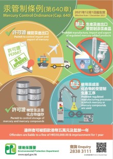 《汞管制条例》规管汞(俗称「水银」)、汞混合物及汞化合物的出口、进口、存放及使用;管制某些添汞产品的出口、进口、制造及供应;以及管制使用汞或汞化合物的某些制造工序。