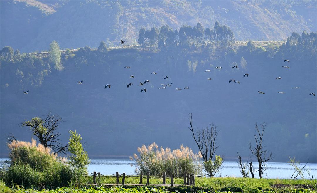 由于独特的气候资源和良好的生态环境,邛海已经成为我国南方候鸟的重要栖息地之一,每年有大量的鸟在邛海湿地过冬。随着生态恢复工程的实施,如今,邛海周边分六期建成了邛海国家湿地公园,湿地面积超过2万余亩,湿地环湖公路达35公里。