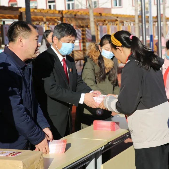 法官王建国和法官助理彭欢欢、周荣怡向同学们发放宪法宣传册,同时嘱咐同学们加强法律学习,依据法律规定行使权利,受到侵害时,敢于拿起法律武器保护自己。