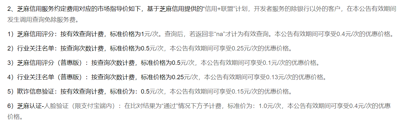 对芝麻信用来说,这同样是一款可以带来盈利的「付费产品」。在蚂蚁金服官网查询的《业务协作费公告(芝麻信用)2017 年 03 版》中说明,对与芝麻信用签署了《芝麻信用服务合同》的客户,芝麻信用提供了芝麻信用评分(「是指芝麻信用以分数形式对用户信用状况进行综合反映的表达。」)等 6 种付费查询,以芝麻信用评分为例,可以通过姓名和身份证号进行查询,按有效查询计费,标准价格为 1 元/次。